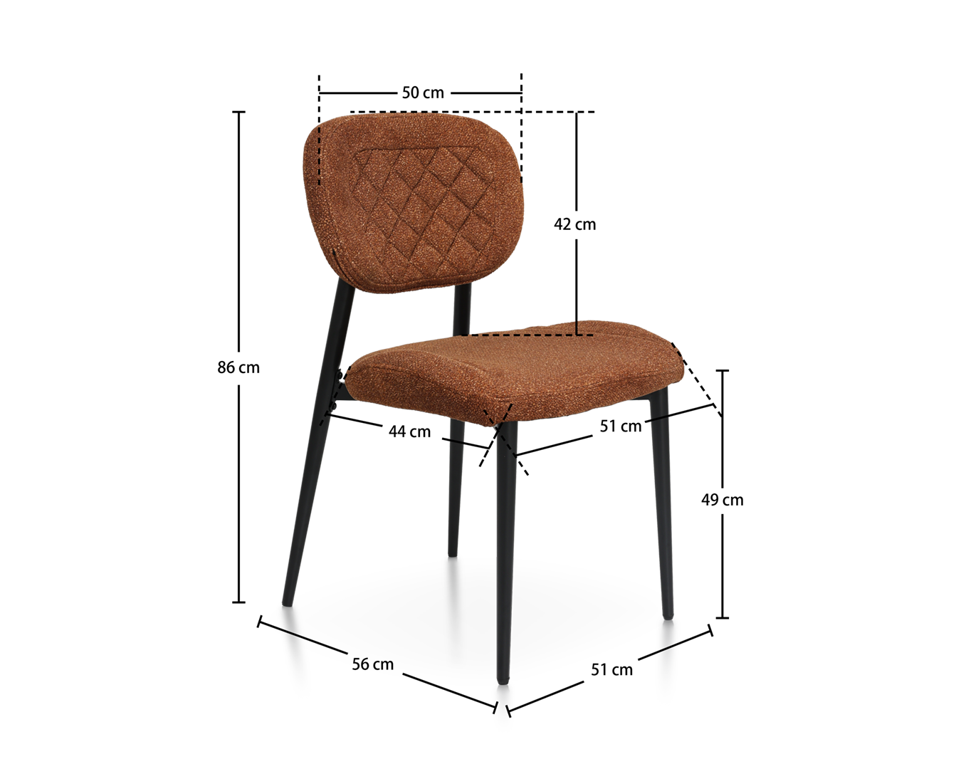 • Het zwarte metalen frame biedt niet alleen robuuste stabiliteit, maar vult de rijke bruine bekleding ook prachtig aan. Het ontwerp van de stoel omvat een gebogen rugleuning en een gewatteerde stoel, wat zorgt voor maximaal comfort voor alle gebruikers. Of u nu een etentje organiseert of alleen geniet van een rustige maaltijd, deze stoel zal uw eetervaring verheffen.