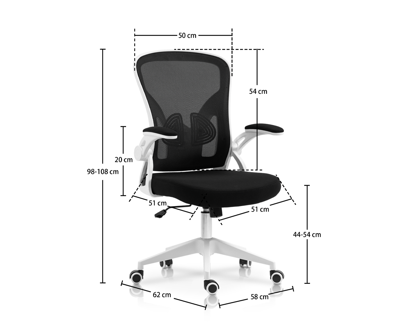 • Beschikt over een strak en eigentijds ontwerp met een zwarte mesh-rugleuning en stoel, aangevuld met witte armleuningen en een vijfpuntige wielenbasis. Het gaasmateriaal draagt ​​niet alleen bij aan het stijlvolle uiterlijk van de stoel, maar biedt ook uitstekend ademend vermogen, zodat u de hele dag koel en comfortabel blijft.