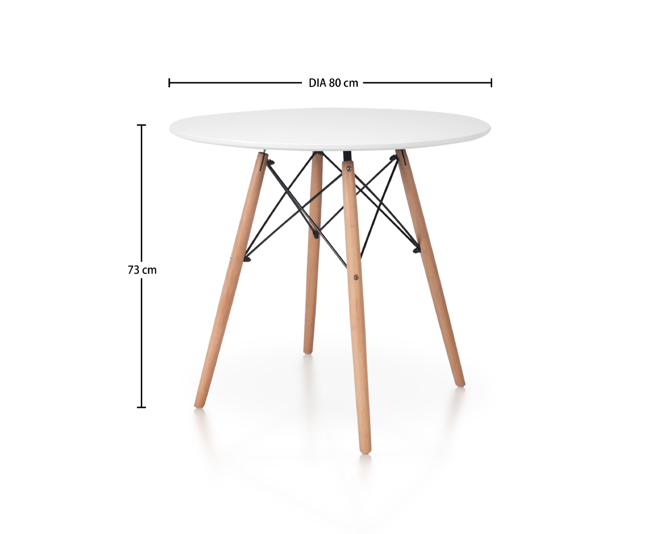 • De ronde top van de tafel, gemaakt van premium dichtheidsbord, heeft een ongerept wit oppervlak dat verfijning en eenvoud uitstraalt. De natuurlijke houten benen bieden een warm contrast met de witte tafelblad, waardoor een evenwichtige en harmonieuze uitstraling ontstaat. Het zwarte draadframe dat de benen verbindt, voegt zowel sterkte als een moderne esthetiek toe, waardoor deze tafel een opvallend stuk in elke kamer is.