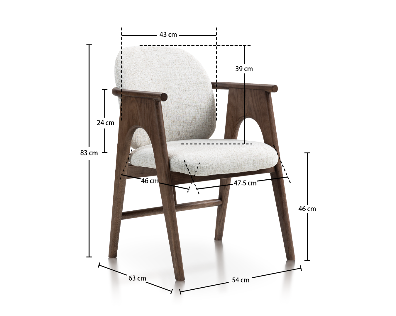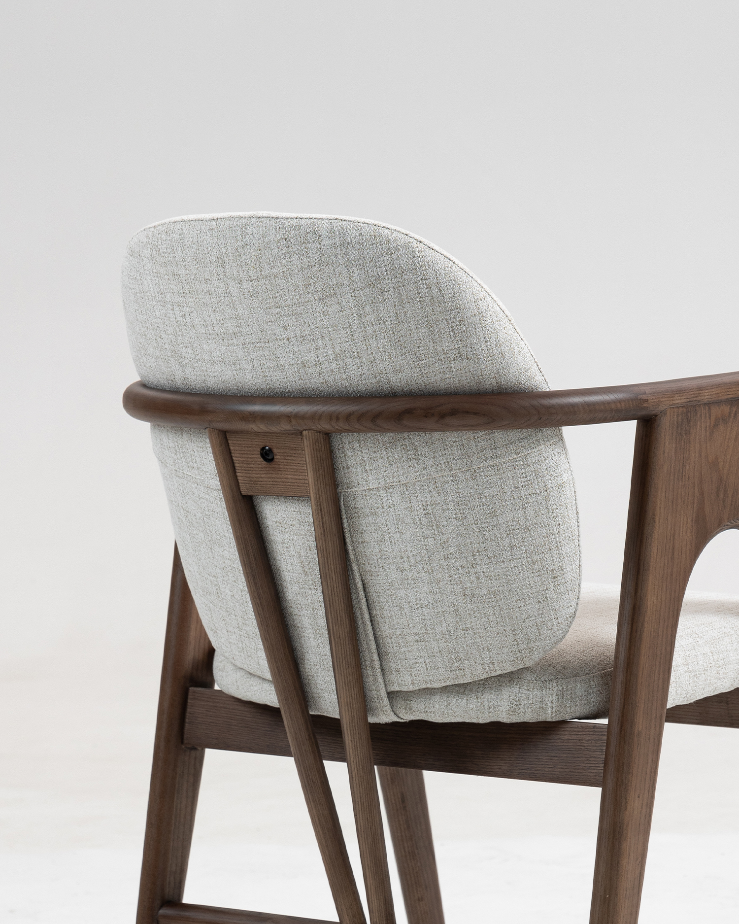 • De stoel is gemaakt van hoogwaardig ashout en heeft een rijke, warme afwerking die de natuurlijke schoonheid van het materiaal accentueert. De unieke gebogen armleuningen voegen zowel stijl als functionaliteit toe, zodat u achterover kunt leunen en ontspannen in ultiem comfort.
